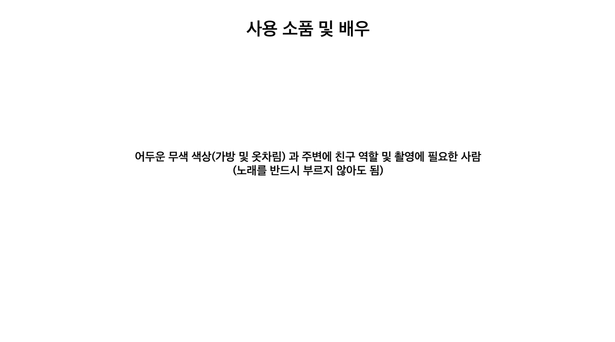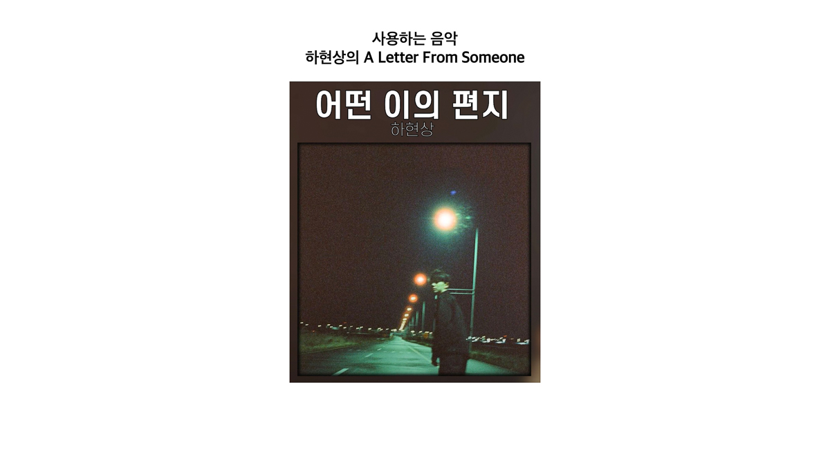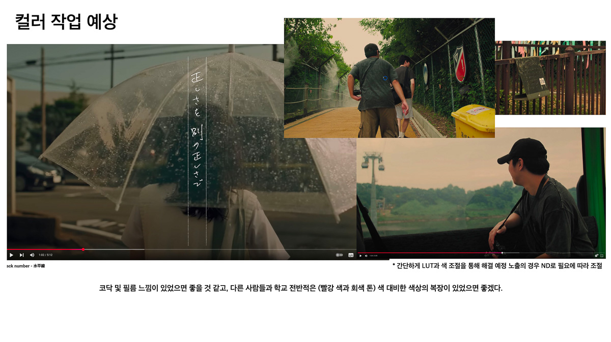 평소에 생각하면서 꼭 찍어보고 싶은 욕심이 컸기 때문에 새롭게 시도 해보려고 직접 했다. 특히나 뮤비 분석을 집에서 자꾸 하다보니 J-POP 스타일을 한번 비슷하게 만들어 보고자 하는 마음도 있었다. 음악의 경우 생각 했던 스토리와 적합할 만한건 하현상의 ‘어떤 이의 편지’ 가 좋을 것 같아서 채택!