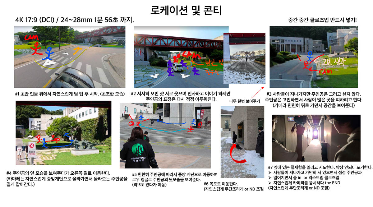 확실히 좋다! 제일 베스트는 건물 옥상에 강한 조명을 때려서 햇빛 느낌의 플레어를 만들었으면 더욱 좋았을 것 같았다. (렌즈는 토키나 28-70) 어째든 1시간 안에 촬영하고 후반에서 작업하다 보니 욕심이 컸는데 결과적으로 성공한 롱테이크 작품이다. 총 5개의 테이크로 끝냈고, 1절 타이밍 계산 후 팀원들도 너무 더워 하는 것 같아서 중단.